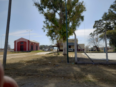 Lamentablemente al ingreso del pueblo una obra de riego, un canal fue construido sobre la traza ferroviaria por lo tanto acá desaparecen las vías.